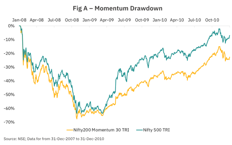 Moreover, Factors can face longer drawdowns or be more volatile over a period of time. To illustrate this point, we take a look at the drawdowns for the Momentum and the Value Factor and Comparing Momentum Drawdown with Nifty 500. Post the global financial crisis, the Momentum Factor took time to recover which led to a longer drawdown period. On the other hand, the Value Factor, witnessed a steeper drawdown post 2018 and took more than 40 months to recover.