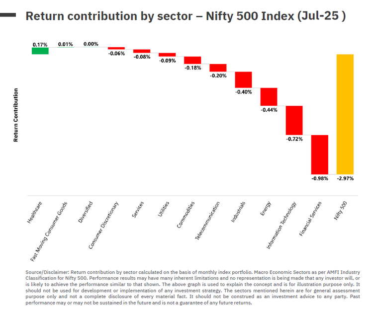 - All segments of the market—large, mid, small and microcaps—delivered negative returns in July 2025, highlighting widespread weakness across the board.
