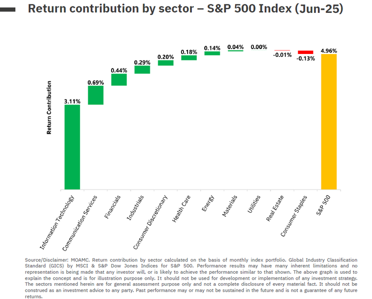 - S&P 500 gained 4.96% in June, with IT sector contributing to more than 60% of the overall index’s return.