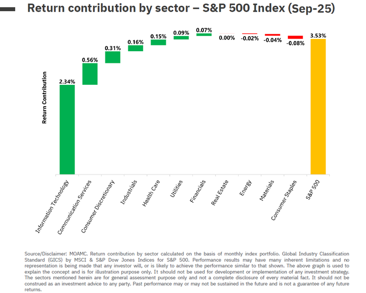 - S&P 500 rose 3.53% in September, with IT and Consumer Services contributing 2.34%and 0.56% to index returns.